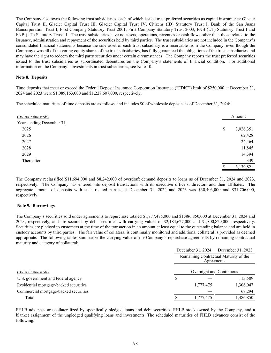 The Company also owns the following trust subsidiaries, each of which issued trust preferred securities as capital instruments: Glacier Capital Trust II, Glacier Capital Trust III, Glacier Capital Trust IV, Citizens (ID) Statutory Trust I, Bank of the San Juans Bancorporation Trust I, First Company Statutory Trust 2001, First Company Statutory Trust 2003, FNB (UT) Statutory Trust I and FNB (UT) Statutory Trust II. The trust subsidiaries have no assets, operations, revenues or cash flows other than those related to the issuance, administration and repayment of the securities held by third parties. The trust subsidiaries are not included in the Company’s consolidated financial statements because the sole asset of each trust subsidiary is a receivable from the Company, even though the Company owns all of the voting equity shares of the trust subsidiaries, has fully guaranteed the obligations of the trust subsidiaries and may have the right to redeem the third party securities under certain circumstances. The Company reports the trust preferred securities issued to the trust subsidiaries as subordinated debentures on the Company’s statements of financial condition. For additional information on the Company’s investments in trust subsidiaries, see Note 10. Note 8. Deposits Time deposits that meet or exceed the Federal Deposit Insurance Corporation Insurance (“FDIC”) limit of $250,000 at December 31, 2024 and 2023 were $1,089,163,000 and $1,227,607,000, respectively. The scheduled maturities of time deposits are as follows and includes $0 of wholesale deposits as of December 31, 2024: (Dollars in thousands) Amount Years ending December 31, 2025 $ 3,026,351 2026 62,428 2027 24,464 2028 11,845 2029 14,394 Thereafter 339 $ 3,139,821 The Company reclassified $11,694,000 and $8,242,000 of overdraft demand deposits to loans as of December 31, 2024 and 2023, respectively. The Company has entered into deposit transactions with its executive officers, directors and their affiliates. The aggregate amount of deposits with such related parties at December 31, 2024 and 2023 was $30,403,000 and $31,706,000, respectively. Note 9. Borrowings The Company’s securities sold under agreements to repurchase totaled $1,777,475,000 and $1,486,850,000 at December 31, 2024 and 2023, respectively, and are secured by debt securities with carrying values of $2,184,627,000 and $1,800,829,000, respectively. Securities are pledged to customers at the time of the transaction in an amount at least equal to the outstanding balance and are held in custody accounts by third parties. The fair value of collateral is continually monitored and additional collateral is provided as deemed appropriate. The following tables summarize the carrying value of the Company’s repurchase agreements by remaining contractual maturity and category of collateral: December 31, 2024 December 31, 2023 Remaining Contractual Maturity of the Agreements (Dollars in thousands) Overnight and Continuous U.S. government and federal agency $ — 113,509 Residential mortgage-backed securities 1,777,475 1,306,047 Commercial mortgage-backed securities — 67,294 Total $ 1,777,475 1,486,850 FHLB advances are collateralized by specifically pledged loans and debt securities, FHLB stock owned by the Company, and a blanket assignment of the unpledged qualifying loans and investments. The scheduled maturities of FHLB advances consist of the following: 98