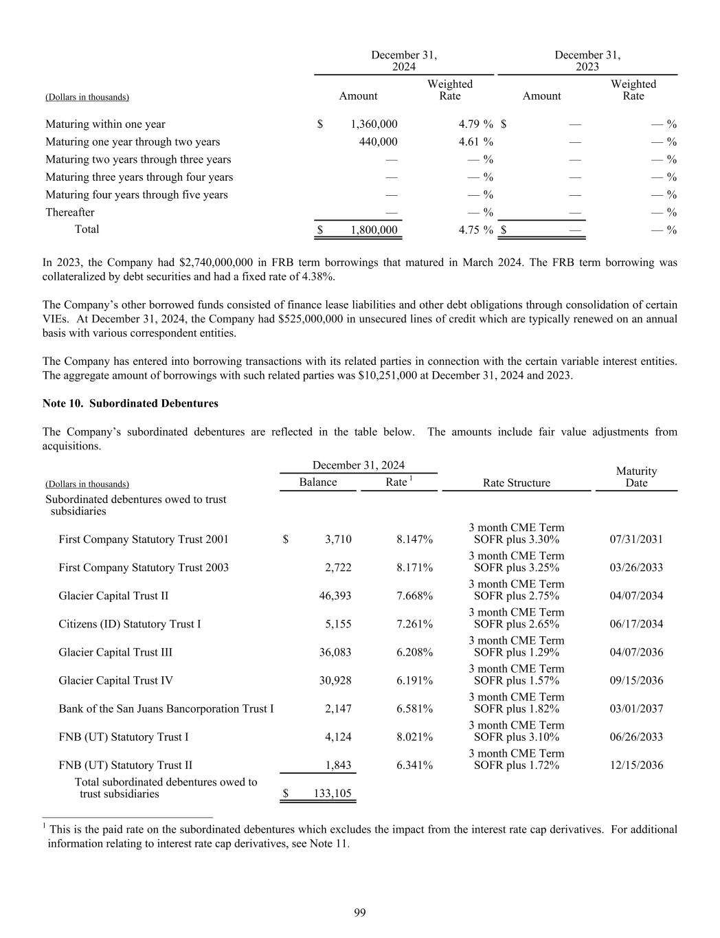 December 31, 2024 December 31, 2023 (Dollars in thousands) Amount Weighted Rate Amount Weighted Rate Maturing within one year $ 1,360,000 4.79 % $ — — % Maturing one year through two years 440,000 4.61 % — — % Maturing two years through three years — — % — — % Maturing three years through four years — — % — — % Maturing four years through five years — — % — — % Thereafter — — % — — % Total $ 1,800,000 4.75 % $ — — % In 2023, the Company had $2,740,000,000 in FRB term borrowings that matured in March 2024. The FRB term borrowing was collateralized by debt securities and had a fixed rate of 4.38%. The Company’s other borrowed funds consisted of finance lease liabilities and other debt obligations through consolidation of certain VIEs. At December 31, 2024, the Company had $525,000,000 in unsecured lines of credit which are typically renewed on an annual basis with various correspondent entities. The Company has entered into borrowing transactions with its related parties in connection with the certain variable interest entities. The aggregate amount of borrowings with such related parties was $10,251,000 at December 31, 2024 and 2023. Note 10. Subordinated Debentures The Company’s subordinated debentures are reflected in the table below. The amounts include fair value adjustments from acquisitions. December 31, 2024 Rate Structure Maturity Date(Dollars in thousands) Balance Rate 1 Subordinated debentures owed to trust subsidiaries First Company Statutory Trust 2001 $ 3,710 8.147% 3 month CME Term SOFR plus 3.30% 07/31/2031 First Company Statutory Trust 2003 2,722 8.171% 3 month CME Term SOFR plus 3.25% 03/26/2033 Glacier Capital Trust II 46,393 7.668% 3 month CME Term SOFR plus 2.75% 04/07/2034 Citizens (ID) Statutory Trust I 5,155 7.261% 3 month CME Term SOFR plus 2.65% 06/17/2034 Glacier Capital Trust III 36,083 6.208% 3 month CME Term SOFR plus 1.29% 04/07/2036 Glacier Capital Trust IV 30,928 6.191% 3 month CME Term SOFR plus 1.57% 09/15/2036 Bank of the San Juans Bancorporation Trust I 2,147 6.581% 3 month CME Term SOFR plus 1.82% 03/01/2037 FNB (UT) Statutory Trust I 4,124 8.021% 3 month CME Term SOFR plus 3.10% 06/26/2033 FNB (UT) Statutory Trust II 1,843 6.341% 3 month CME Term SOFR plus 1.72% 12/15/2036 Total subordinated debentures owed to trust subsidiaries $ 133,105 _____________________________ 1 This is the paid rate on the subordinated debentures which excludes the impact from the interest rate cap derivatives. For additional information relating to interest rate cap derivatives, see Note 11. 99
