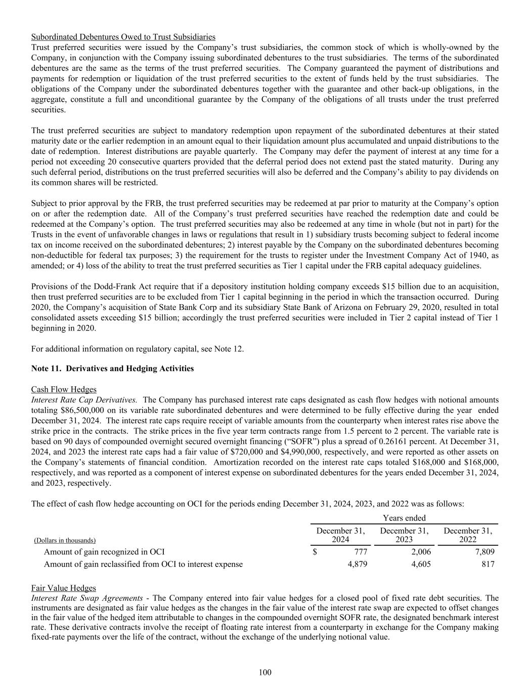 Subordinated Debentures Owed to Trust Subsidiaries Trust preferred securities were issued by the Company’s trust subsidiaries, the common stock of which is wholly-owned by the Company, in conjunction with the Company issuing subordinated debentures to the trust subsidiaries. The terms of the subordinated debentures are the same as the terms of the trust preferred securities. The Company guaranteed the payment of distributions and payments for redemption or liquidation of the trust preferred securities to the extent of funds held by the trust subsidiaries. The obligations of the Company under the subordinated debentures together with the guarantee and other back-up obligations, in the aggregate, constitute a full and unconditional guarantee by the Company of the obligations of all trusts under the trust preferred securities. The trust preferred securities are subject to mandatory redemption upon repayment of the subordinated debentures at their stated maturity date or the earlier redemption in an amount equal to their liquidation amount plus accumulated and unpaid distributions to the date of redemption. Interest distributions are payable quarterly. The Company may defer the payment of interest at any time for a period not exceeding 20 consecutive quarters provided that the deferral period does not extend past the stated maturity. During any such deferral period, distributions on the trust preferred securities will also be deferred and the Company’s ability to pay dividends on its common shares will be restricted. Subject to prior approval by the FRB, the trust preferred securities may be redeemed at par prior to maturity at the Company’s option on or after the redemption date. All of the Company’s trust preferred securities have reached the redemption date and could be redeemed at the Company’s option. The trust preferred securities may also be redeemed at any time in whole (but not in part) for the Trusts in the event of unfavorable changes in laws or regulations that result in 1) subsidiary trusts becoming subject to federal income tax on income received on the subordinated debentures; 2) interest payable by the Company on the subordinated debentures becoming non-deductible for federal tax purposes; 3) the requirement for the trusts to register under the Investment Company Act of 1940, as amended; or 4) loss of the ability to treat the trust preferred securities as Tier 1 capital under the FRB capital adequacy guidelines. Provisions of the Dodd-Frank Act require that if a depository institution holding company exceeds $15 billion due to an acquisition, then trust preferred securities are to be excluded from Tier 1 capital beginning in the period in which the transaction occurred. During 2020, the Company’s acquisition of State Bank Corp and its subsidiary State Bank of Arizona on February 29, 2020, resulted in total consolidated assets exceeding $15 billion; accordingly the trust preferred securities were included in Tier 2 capital instead of Tier 1 beginning in 2020. For additional information on regulatory capital, see Note 12. Note 11. Derivatives and Hedging Activities Cash Flow Hedges Interest Rate Cap Derivatives. The Company has purchased interest rate caps designated as cash flow hedges with notional amounts totaling $86,500,000 on its variable rate subordinated debentures and were determined to be fully effective during the year ended December 31, 2024. The interest rate caps require receipt of variable amounts from the counterparty when interest rates rise above the strike price in the contracts. The strike prices in the five year term contracts range from 1.5 percent to 2 percent. The variable rate is based on 90 days of compounded overnight secured overnight financing (“SOFR”) plus a spread of 0.26161 percent. At December 31, 2024, and 2023 the interest rate caps had a fair value of $720,000 and $4,990,000, respectively, and were reported as other assets on the Company’s statements of financial condition. Amortization recorded on the interest rate caps totaled $168,000 and $168,000, respectively, and was reported as a component of interest expense on subordinated debentures for the years ended December 31, 2024, and 2023, respectively. The effect of cash flow hedge accounting on OCI for the periods ending December 31, 2024, 2023, and 2022 was as follows: Years ended (Dollars in thousands) December 31, 2024 December 31, 2023 December 31, 2022 Amount of gain recognized in OCI $ 777 2,006 7,809 Amount of gain reclassified from OCI to interest expense 4,879 4,605 817 Fair Value Hedges Interest Rate Swap Agreements - The Company entered into fair value hedges for a closed pool of fixed rate debt securities. The instruments are designated as fair value hedges as the changes in the fair value of the interest rate swap are expected to offset changes in the fair value of the hedged item attributable to changes in the compounded overnight SOFR rate, the designated benchmark interest rate. These derivative contracts involve the receipt of floating rate interest from a counterparty in exchange for the Company making fixed-rate payments over the life of the contract, without the exchange of the underlying notional value. 100