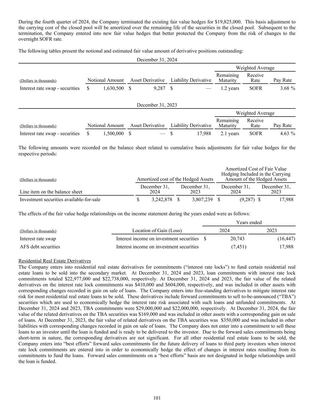 During the fourth quarter of 2024, the Company terminated the existing fair value hedges for $19,825,000. This basis adjustment to the carrying cost of the closed pool will be amortized over the remaining life of the securities in the closed pool. Subsequent to the termination, the Company entered into new fair value hedges that better protected the Company from the risk of changes to the overnight SOFR rate. The following tables present the notional and estimated fair value amount of derivative positions outstanding: December 31, 2024 Weighted Average (Dollars in thousands) Notional Amount Asset Derivative Liability Derivative Remaining Maturity Receive Rate Pay Rate Interest rate swap - securities $ 1,630,500 $ 9,287 $ — 1.2 years SOFR 3.68 % December 31, 2023 Weighted Average (Dollars in thousands) Notional Amount Asset Derivative Liability Derivative Remaining Maturity Receive Rate Pay Rate Interest rate swap - securities $ 1,500,000 $ — $ 17,988 2.1 years SOFR 4.63 % The following amounts were recorded on the balance sheet related to cumulative basis adjustments for fair value hedges for the respective periods: (Dollars in thousands) Amortized cost of the Hedged Assets Amortized Cost of Fair Value Hedging Included in the Carrying Amount of the Hedged Assets Line item on the balance sheet December 31, 2024 December 31, 2023 December 31, 2024 December 31, 2023 Investment securities available-for-sale $ 3,242,878 $ 3,807,239 $ (9,287) $ 17,988 The effects of the fair value hedge relationships on the income statement during the years ended were as follows: Years ended (Dollars in thousands) Location of Gain (Loss) 2024 2023 Interest rate swap Interest income on investment securities $ 20,743 (16,447) AFS debt securities Interest income on investment securities (7,451) 17,988 Residential Real Estate Derivatives The Company enters into residential real estate derivatives for commitments (“interest rate locks”) to fund certain residential real estate loans to be sold into the secondary market. At December 31, 2024 and 2023, loan commitments with interest rate lock commitments totaled $22,977,000 and $22,738,000, respectively. At December 31, 2024 and 2023, the fair value of the related derivatives on the interest rate lock commitments was $410,000 and $604,000, respectively, and was included in other assets with corresponding changes recorded in gain on sale of loans. The Company enters into free-standing derivatives to mitigate interest rate risk for most residential real estate loans to be sold. These derivatives include forward commitments to sell to-be-announced (“TBA”) securities which are used to economically hedge the interest rate risk associated with such loans and unfunded commitments. At December 31, 2024 and 2023, TBA commitments were $29,000,000 and $22,000,000, respectively. At December 31, 2024, the fair value of the related derivatives on the TBA securities was $169,000 and was included in other assets with a corresponding gain on sale of loans. At December 31, 2023, the fair value of related derivatives on the TBA securities was $350,000 and was included in other liabilities with corresponding changes recorded in gain on sale of loans. The Company does not enter into a commitment to sell these loans to an investor until the loan is funded and is ready to be delivered to the investor. Due to the forward sales commitments being short-term in nature, the corresponding derivatives are not significant. For all other residential real estate loans to be sold, the Company enters into “best efforts” forward sales commitments for the future delivery of loans to third party investors when interest rate lock commitments are entered into in order to economically hedge the effect of changes in interest rates resulting from its commitments to fund the loans. Forward sales commitments on a “best efforts” basis are not designated in hedge relationships until the loan is funded. 101