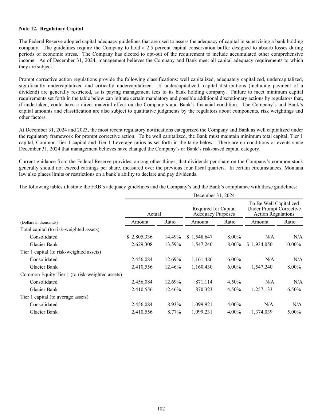 Note 12. Regulatory Capital The Federal Reserve adopted capital adequacy guidelines that are used to assess the adequacy of capital in supervising a bank holding company. The guidelines require the Company to hold a 2.5 percent capital conservation buffer designed to absorb losses during periods of economic stress. The Company has elected to opt-out of the requirement to include accumulated other comprehensive income. As of December 31, 2024, management believes the Company and Bank meet all capital adequacy requirements to which they are subject. Prompt corrective action regulations provide the following classifications: well capitalized, adequately capitalized, undercapitalized, significantly undercapitalized and critically undercapitalized. If undercapitalized, capital distributions (including payment of a dividend) are generally restricted, as is paying management fees to its bank holding company. Failure to meet minimum capital requirements set forth in the table below can initiate certain mandatory and possible additional discretionary actions by regulators that, if undertaken, could have a direct material effect on the Company’s and Bank’s financial condition. The Company’s and Bank’s capital amounts and classification are also subject to qualitative judgments by the regulators about components, risk weightings and other factors. At December 31, 2024 and 2023, the most recent regulatory notifications categorized the Company and Bank as well capitalized under the regulatory framework for prompt corrective action. To be well capitalized, the Bank must maintain minimum total capital, Tier 1 capital, Common Tier 1 capital and Tier 1 Leverage ratios as set forth in the table below. There are no conditions or events since December 31, 2024 that management believes have changed the Company’s or Bank’s risk-based capital category. Current guidance from the Federal Reserve provides, among other things, that dividends per share on the Company’s common stock generally should not exceed earnings per share, measured over the previous four fiscal quarters. In certain circumstances, Montana law also places limits or restrictions on a bank’s ability to declare and pay dividends. The following tables illustrate the FRB’s adequacy guidelines and the Company’s and the Bank’s compliance with those guidelines: December 31, 2024 Actual Required for Capital Adequacy Purposes To Be Well Capitalized Under Prompt Corrective Action Regulations (Dollars in thousands) Amount Ratio Amount Ratio Amount Ratio Total capital (to risk-weighted assets) Consolidated $ 2,805,336 14.49% $ 1,548,647 8.00% N/A N/A Glacier Bank 2,629,308 13.59% 1,547,240 8.00% $ 1,934,050 10.00% Tier 1 capital (to risk-weighted assets) Consolidated 2,456,084 12.69% 1,161,486 6.00% N/A N/A Glacier Bank 2,410,556 12.46% 1,160,430 6.00% 1,547,240 8.00% Common Equity Tier 1 (to risk-weighted assets) Consolidated 2,456,084 12.69% 871,114 4.50% N/A N/A Glacier Bank 2,410,556 12.46% 870,323 4.50% 1,257,133 6.50% Tier 1 capital (to average assets) Consolidated 2,456,084 8.93% 1,099,921 4.00% N/A N/A Glacier Bank 2,410,556 8.77% 1,099,231 4.00% 1,374,039 5.00% 102