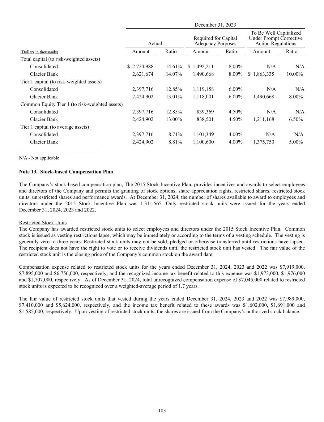 December 31, 2023 Actual Required for Capital Adequacy Purposes To Be Well Capitalized Under Prompt Corrective Action Regulations (Dollars in thousands) Amount Ratio Amount Ratio Amount Ratio Total capital (to risk-weighted assets) Consolidated $ 2,724,988 14.61% $ 1,492,211 8.00% N/A N/A Glacier Bank 2,621,674 14.07% 1,490,668 8.00% $ 1,863,335 10.00% Tier 1 capital (to risk-weighted assets) Consolidated 2,397,716 12.85% 1,119,158 6.00% N/A N/A Glacier Bank 2,424,902 13.01% 1,118,001 6.00% 1,490,668 8.00% Common Equity Tier 1 (to risk-weighted assets) Consolidated 2,397,716 12.85% 839,369 4.50% N/A N/A Glacier Bank 2,424,902 13.00% 838,501 4.50% 1,211,168 6.50% Tier 1 capital (to average assets) Consolidated 2,397,716 8.71% 1,101,349 4.00% N/A N/A Glacier Bank 2,424,902 8.81% 1,100,600 4.00% 1,375,750 5.00% ______________________________ N/A - Not applicable Note 13. Stock-based Compensation Plan The Company’s stock-based compensation plan, The 2015 Stock Incentive Plan, provides incentives and awards to select employees and directors of the Company and permits the granting of stock options, share appreciation rights, restricted shares, restricted stock units, unrestricted shares and performance awards. At December 31, 2024, the number of shares available to award to employees and directors under the 2015 Stock Incentive Plan was 1,311,565. Only restricted stock units were issued for the years ended December 31, 2024, 2023 and 2022. Restricted Stock Units The Company has awarded restricted stock units to select employees and directors under the 2015 Stock Incentive Plan. Common stock is issued as vesting restrictions lapse, which may be immediately or according to the terms of a vesting schedule. The vesting is generally zero to three years. Restricted stock units may not be sold, pledged or otherwise transferred until restrictions have lapsed. The recipient does not have the right to vote or to receive dividends until the restricted stock unit has vested. The fair value of the restricted stock unit is the closing price of the Company’s common stock on the award date. Compensation expense related to restricted stock units for the years ended December 31, 2024, 2023 and 2022 was $7,919,000, $7,895,000 and $6,756,000, respectively, and the recognized income tax benefit related to this expense was $1,973,000, $1,976,000 and $1,707,000, respectively. As of December 31, 2024, total unrecognized compensation expense of $7,045,000 related to restricted stock units is expected to be recognized over a weighted-average period of 1.7 years. The fair value of restricted stock units that vested during the years ended December 31, 2024, 2023 and 2022 was $7,989,000, $7,410,000 and $5,624,000, respectively, and the income tax benefit related to these awards was $1,602,000, $1,691,000 and $1,585,000, respectively. Upon vesting of restricted stock units, the shares are issued from the Company’s authorized stock balance. 103