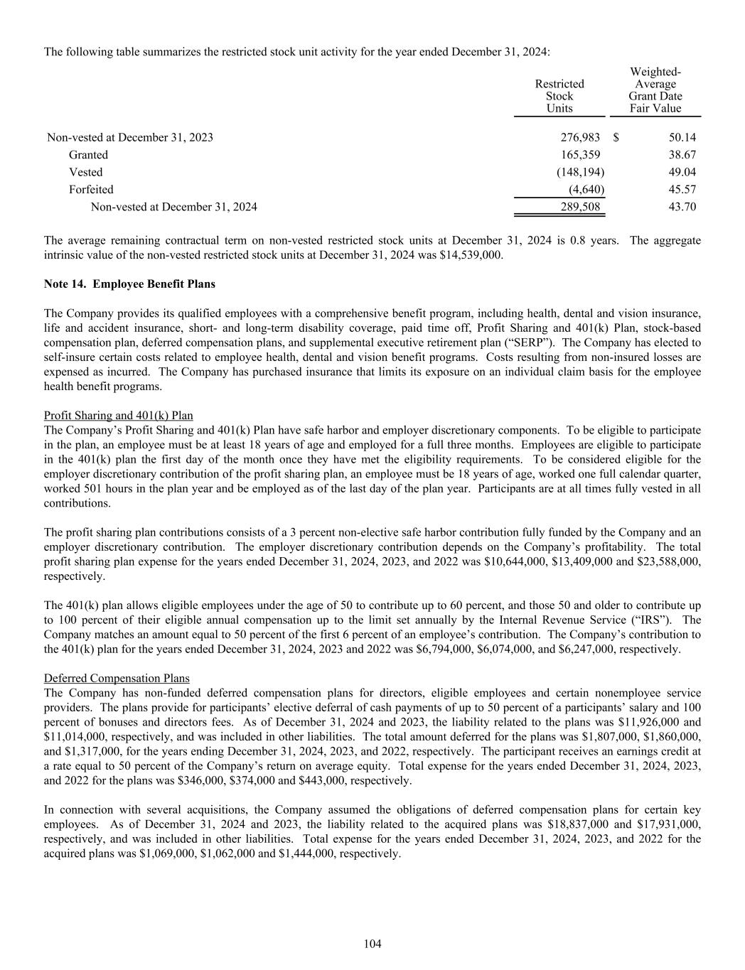 The following table summarizes the restricted stock unit activity for the year ended December 31, 2024: Restricted Stock Units Weighted- Average Grant Date Fair Value Non-vested at December 31, 2023 276,983 $ 50.14 Granted 165,359 38.67 Vested (148,194) 49.04 Forfeited (4,640) 45.57 Non-vested at December 31, 2024 289,508 43.70 The average remaining contractual term on non-vested restricted stock units at December 31, 2024 is 0.8 years. The aggregate intrinsic value of the non-vested restricted stock units at December 31, 2024 was $14,539,000. Note 14. Employee Benefit Plans The Company provides its qualified employees with a comprehensive benefit program, including health, dental and vision insurance, life and accident insurance, short- and long-term disability coverage, paid time off, Profit Sharing and 401(k) Plan, stock-based compensation plan, deferred compensation plans, and supplemental executive retirement plan (“SERP”). The Company has elected to self-insure certain costs related to employee health, dental and vision benefit programs. Costs resulting from non-insured losses are expensed as incurred. The Company has purchased insurance that limits its exposure on an individual claim basis for the employee health benefit programs. Profit Sharing and 401(k) Plan The Company’s Profit Sharing and 401(k) Plan have safe harbor and employer discretionary components. To be eligible to participate in the plan, an employee must be at least 18 years of age and employed for a full three months. Employees are eligible to participate in the 401(k) plan the first day of the month once they have met the eligibility requirements. To be considered eligible for the employer discretionary contribution of the profit sharing plan, an employee must be 18 years of age, worked one full calendar quarter, worked 501 hours in the plan year and be employed as of the last day of the plan year. Participants are at all times fully vested in all contributions. The profit sharing plan contributions consists of a 3 percent non-elective safe harbor contribution fully funded by the Company and an employer discretionary contribution. The employer discretionary contribution depends on the Company’s profitability. The total profit sharing plan expense for the years ended December 31, 2024, 2023, and 2022 was $10,644,000, $13,409,000 and $23,588,000, respectively. The 401(k) plan allows eligible employees under the age of 50 to contribute up to 60 percent, and those 50 and older to contribute up to 100 percent of their eligible annual compensation up to the limit set annually by the Internal Revenue Service (“IRS”). The Company matches an amount equal to 50 percent of the first 6 percent of an employee’s contribution. The Company’s contribution to the 401(k) plan for the years ended December 31, 2024, 2023 and 2022 was $6,794,000, $6,074,000, and $6,247,000, respectively. Deferred Compensation Plans The Company has non-funded deferred compensation plans for directors, eligible employees and certain nonemployee service providers. The plans provide for participants’ elective deferral of cash payments of up to 50 percent of a participants’ salary and 100 percent of bonuses and directors fees. As of December 31, 2024 and 2023, the liability related to the plans was $11,926,000 and $11,014,000, respectively, and was included in other liabilities. The total amount deferred for the plans was $1,807,000, $1,860,000, and $1,317,000, for the years ending December 31, 2024, 2023, and 2022, respectively. The participant receives an earnings credit at a rate equal to 50 percent of the Company’s return on average equity. Total expense for the years ended December 31, 2024, 2023, and 2022 for the plans was $346,000, $374,000 and $443,000, respectively. In connection with several acquisitions, the Company assumed the obligations of deferred compensation plans for certain key employees. As of December 31, 2024 and 2023, the liability related to the acquired plans was $18,837,000 and $17,931,000, respectively, and was included in other liabilities. Total expense for the years ended December 31, 2024, 2023, and 2022 for the acquired plans was $1,069,000, $1,062,000 and $1,444,000, respectively. 104