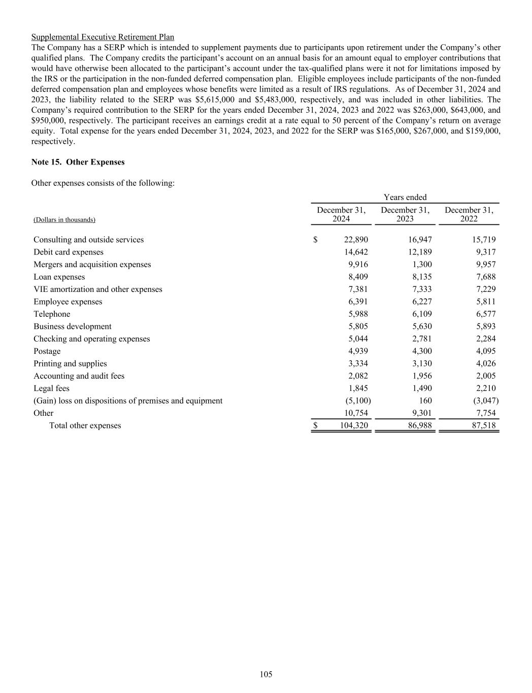 Supplemental Executive Retirement Plan The Company has a SERP which is intended to supplement payments due to participants upon retirement under the Company’s other qualified plans. The Company credits the participant’s account on an annual basis for an amount equal to employer contributions that would have otherwise been allocated to the participant’s account under the tax-qualified plans were it not for limitations imposed by the IRS or the participation in the non-funded deferred compensation plan. Eligible employees include participants of the non-funded deferred compensation plan and employees whose benefits were limited as a result of IRS regulations. As of December 31, 2024 and 2023, the liability related to the SERP was $5,615,000 and $5,483,000, respectively, and was included in other liabilities. The Company’s required contribution to the SERP for the years ended December 31, 2024, 2023 and 2022 was $263,000, $643,000, and $950,000, respectively. The participant receives an earnings credit at a rate equal to 50 percent of the Company’s return on average equity. Total expense for the years ended December 31, 2024, 2023, and 2022 for the SERP was $165,000, $267,000, and $159,000, respectively. Note 15. Other Expenses Other expenses consists of the following: Years ended (Dollars in thousands) December 31, 2024 December 31, 2023 December 31, 2022 Consulting and outside services $ 22,890 16,947 15,719 Debit card expenses 14,642 12,189 9,317 Mergers and acquisition expenses 9,916 1,300 9,957 Loan expenses 8,409 8,135 7,688 VIE amortization and other expenses 7,381 7,333 7,229 Employee expenses 6,391 6,227 5,811 Telephone 5,988 6,109 6,577 Business development 5,805 5,630 5,893 Checking and operating expenses 5,044 2,781 2,284 Postage 4,939 4,300 4,095 Printing and supplies 3,334 3,130 4,026 Accounting and audit fees 2,082 1,956 2,005 Legal fees 1,845 1,490 2,210 (Gain) loss on dispositions of premises and equipment (5,100) 160 (3,047) Other 10,754 9,301 7,754 Total other expenses $ 104,320 86,988 87,518 105