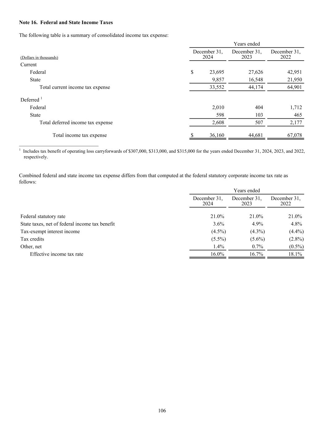 Note 16. Federal and State Income Taxes The following table is a summary of consolidated income tax expense: Years ended (Dollars in thousands) December 31, 2024 December 31, 2023 December 31, 2022 Current Federal $ 23,695 27,626 42,951 State 9,857 16,548 21,950 Total current income tax expense 33,552 44,174 64,901 Deferred 1 Federal 2,010 404 1,712 State 598 103 465 Total deferred income tax expense 2,608 507 2,177 Total income tax expense $ 36,160 44,681 67,078 ______________________________ 1 Includes tax benefit of operating loss carryforwards of $307,000, $313,000, and $315,000 for the years ended December 31, 2024, 2023, and 2022, respectively. Combined federal and state income tax expense differs from that computed at the federal statutory corporate income tax rate as follows: Years ended December 31, 2024 December 31, 2023 December 31, 2022 Federal statutory rate 21.0% 21.0% 21.0% State taxes, net of federal income tax benefit 3.6% 4.9% 4.8% Tax-exempt interest income (4.5%) (4.3%) (4.4%) Tax credits (5.5%) (5.6%) (2.8%) Other, net 1.4% 0.7% (0.5%) Effective income tax rate 16.0% 16.7% 18.1% 106