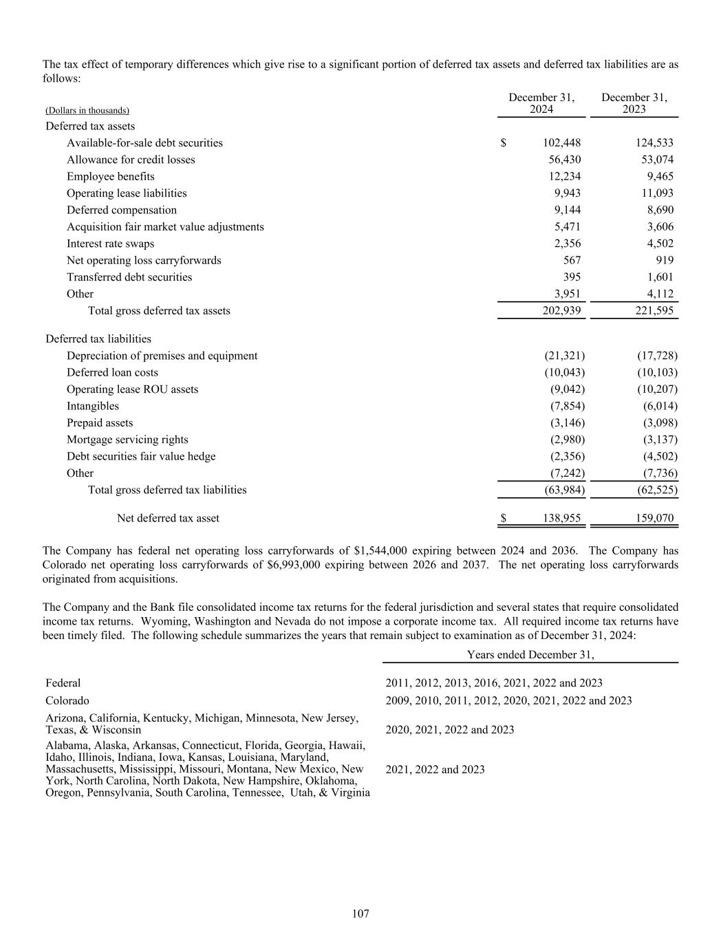 The tax effect of temporary differences which give rise to a significant portion of deferred tax assets and deferred tax liabilities are as follows: (Dollars in thousands) December 31, 2024 December 31, 2023 Deferred tax assets Available-for-sale debt securities $ 102,448 124,533 Allowance for credit losses 56,430 53,074 Employee benefits 12,234 9,465 Operating lease liabilities 9,943 11,093 Deferred compensation 9,144 8,690 Acquisition fair market value adjustments 5,471 3,606 Interest rate swaps 2,356 4,502 Net operating loss carryforwards 567 919 Transferred debt securities 395 1,601 Other 3,951 4,112 Total gross deferred tax assets 202,939 221,595 Deferred tax liabilities Depreciation of premises and equipment (21,321) (17,728) Deferred loan costs (10,043) (10,103) Operating lease ROU assets (9,042) (10,207) Intangibles (7,854) (6,014) Prepaid assets (3,146) (3,098) Mortgage servicing rights (2,980) (3,137) Debt securities fair value hedge (2,356) (4,502) Other (7,242) (7,736) Total gross deferred tax liabilities (63,984) (62,525) Net deferred tax asset $ 138,955 159,070 The Company has federal net operating loss carryforwards of $1,544,000 expiring between 2024 and 2036. The Company has Colorado net operating loss carryforwards of $6,993,000 expiring between 2026 and 2037. The net operating loss carryforwards originated from acquisitions. The Company and the Bank file consolidated income tax returns for the federal jurisdiction and several states that require consolidated income tax returns. Wyoming, Washington and Nevada do not impose a corporate income tax. All required income tax returns have been timely filed. The following schedule summarizes the years that remain subject to examination as of December 31, 2024: Years ended December 31, Federal 2011, 2012, 2013, 2016, 2021, 2022 and 2023 Colorado 2009, 2010, 2011, 2012, 2020, 2021, 2022 and 2023 Arizona, California, Kentucky, Michigan, Minnesota, New Jersey, Texas, & Wisconsin 2020, 2021, 2022 and 2023 Alabama, Alaska, Arkansas, Connecticut, Florida, Georgia, Hawaii, Idaho, Illinois, Indiana, Iowa, Kansas, Louisiana, Maryland, Massachusetts, Mississippi, Missouri, Montana, New Mexico, New York, North Carolina, North Dakota, New Hampshire, Oklahoma, Oregon, Pennsylvania, South Carolina, Tennessee, Utah, & Virginia 2021, 2022 and 2023 107