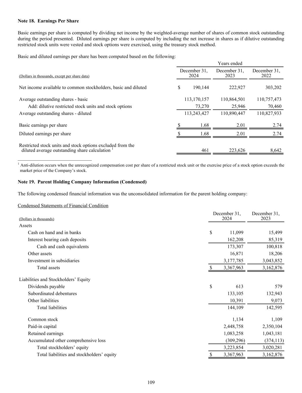 Note 18. Earnings Per Share Basic earnings per share is computed by dividing net income by the weighted-average number of shares of common stock outstanding during the period presented. Diluted earnings per share is computed by including the net increase in shares as if dilutive outstanding restricted stock units were vested and stock options were exercised, using the treasury stock method. Basic and diluted earnings per share has been computed based on the following: Years ended (Dollars in thousands, except per share data) December 31, 2024 December 31, 2023 December 31, 2022 Net income available to common stockholders, basic and diluted $ 190,144 222,927 303,202 Average outstanding shares - basic 113,170,157 110,864,501 110,757,473 Add: dilutive restricted stock units and stock options 73,270 25,946 70,460 Average outstanding shares - diluted 113,243,427 110,890,447 110,827,933 Basic earnings per share $ 1.68 2.01 2.74 Diluted earnings per share $ 1.68 2.01 2.74 Restricted stock units and stock options excluded from the diluted average outstanding share calculation 1 461 223,626 8,642 ______________________________ 1 Anti-dilution occurs when the unrecognized compensation cost per share of a restricted stock unit or the exercise price of a stock option exceeds the market price of the Company’s stock. Note 19. Parent Holding Company Information (Condensed) The following condensed financial information was the unconsolidated information for the parent holding company: Condensed Statements of Financial Condition (Dollars in thousands) December 31, 2024 December 31, 2023 Assets Cash on hand and in banks $ 11,099 15,499 Interest bearing cash deposits 162,208 85,319 Cash and cash equivalents 173,307 100,818 Other assets 16,871 18,206 Investment in subsidiaries 3,177,785 3,043,852 Total assets $ 3,367,963 3,162,876 Liabilities and Stockholders’ Equity Dividends payable $ 613 579 Subordinated debentures 133,105 132,943 Other liabilities 10,391 9,073 Total liabilities 144,109 142,595 Common stock 1,134 1,109 Paid-in capital 2,448,758 2,350,104 Retained earnings 1,083,258 1,043,181 Accumulated other comprehensive loss (309,296) (374,113) Total stockholders’ equity 3,223,854 3,020,281 Total liabilities and stockholders’ equity $ 3,367,963 3,162,876 109