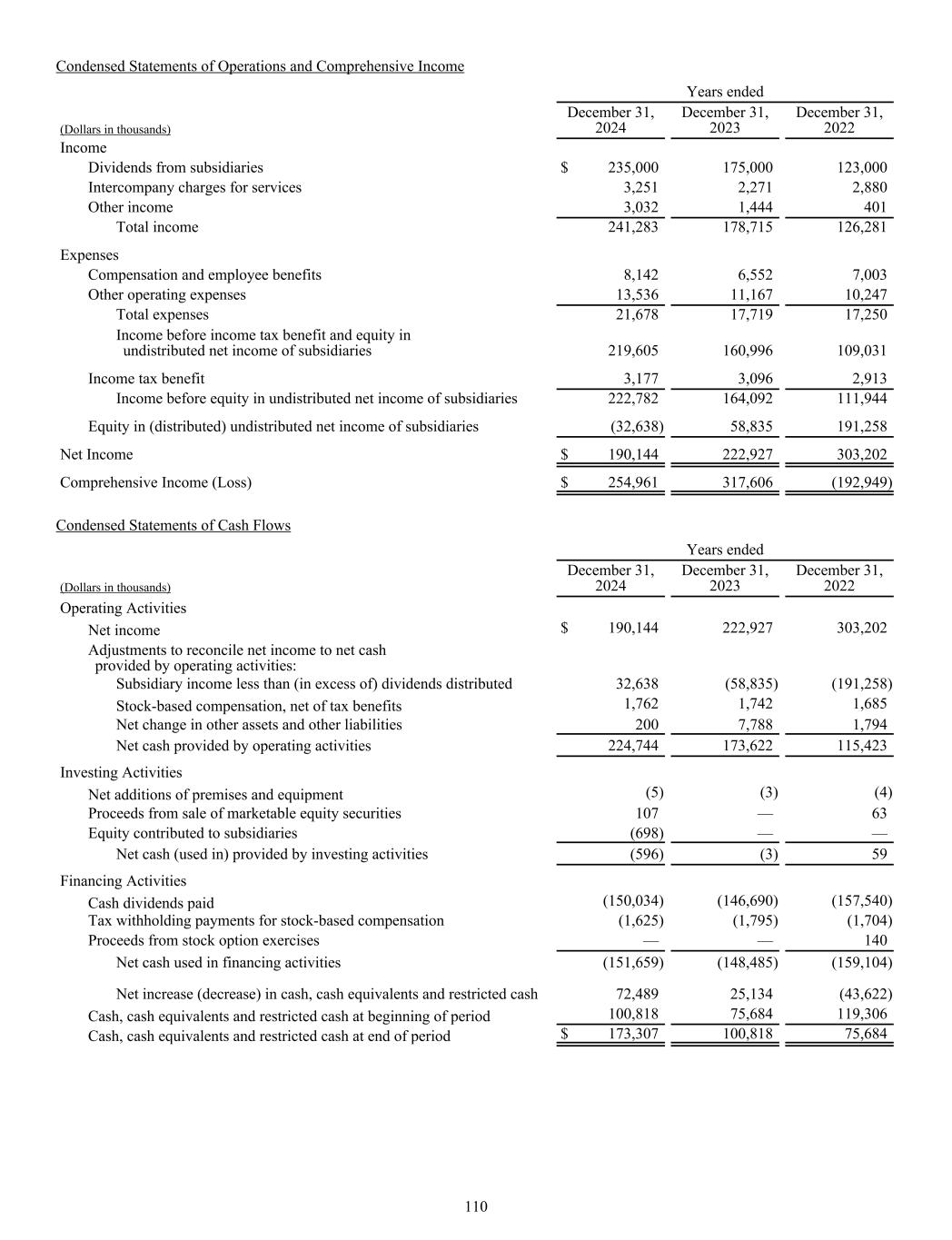 Condensed Statements of Operations and Comprehensive Income Years ended (Dollars in thousands) December 31, 2024 December 31, 2023 December 31, 2022 Income Dividends from subsidiaries $ 235,000 175,000 123,000 Intercompany charges for services 3,251 2,271 2,880 Other income 3,032 1,444 401 Total income 241,283 178,715 126,281 Expenses Compensation and employee benefits 8,142 6,552 7,003 Other operating expenses 13,536 11,167 10,247 Total expenses 21,678 17,719 17,250 Income before income tax benefit and equity in undistributed net income of subsidiaries 219,605 160,996 109,031 Income tax benefit 3,177 3,096 2,913 Income before equity in undistributed net income of subsidiaries 222,782 164,092 111,944 Equity in (distributed) undistributed net income of subsidiaries (32,638) 58,835 191,258 Net Income $ 190,144 222,927 303,202 Comprehensive Income (Loss) $ 254,961 317,606 (192,949) Condensed Statements of Cash Flows Years ended (Dollars in thousands) December 31, 2024 December 31, 2023 December 31, 2022 Operating Activities Net income $ 190,144 222,927 303,202 Adjustments to reconcile net income to net cash provided by operating activities: Subsidiary income less than (in excess of) dividends distributed 32,638 (58,835) (191,258) Stock-based compensation, net of tax benefits 1,762 1,742 1,685 Net change in other assets and other liabilities 200 7,788 1,794 Net cash provided by operating activities 224,744 173,622 115,423 Investing Activities Net additions of premises and equipment (5) (3) (4) Proceeds from sale of marketable equity securities 107 — 63 Equity contributed to subsidiaries (698) — — Net cash (used in) provided by investing activities (596) (3) 59 Financing Activities Cash dividends paid (150,034) (146,690) (157,540) Tax withholding payments for stock-based compensation (1,625) (1,795) (1,704) Proceeds from stock option exercises — — 140 Net cash used in financing activities (151,659) (148,485) (159,104) Net increase (decrease) in cash, cash equivalents and restricted cash 72,489 25,134 (43,622) Cash, cash equivalents and restricted cash at beginning of period 100,818 75,684 119,306 Cash, cash equivalents and restricted cash at end of period $ 173,307 100,818 75,684 110