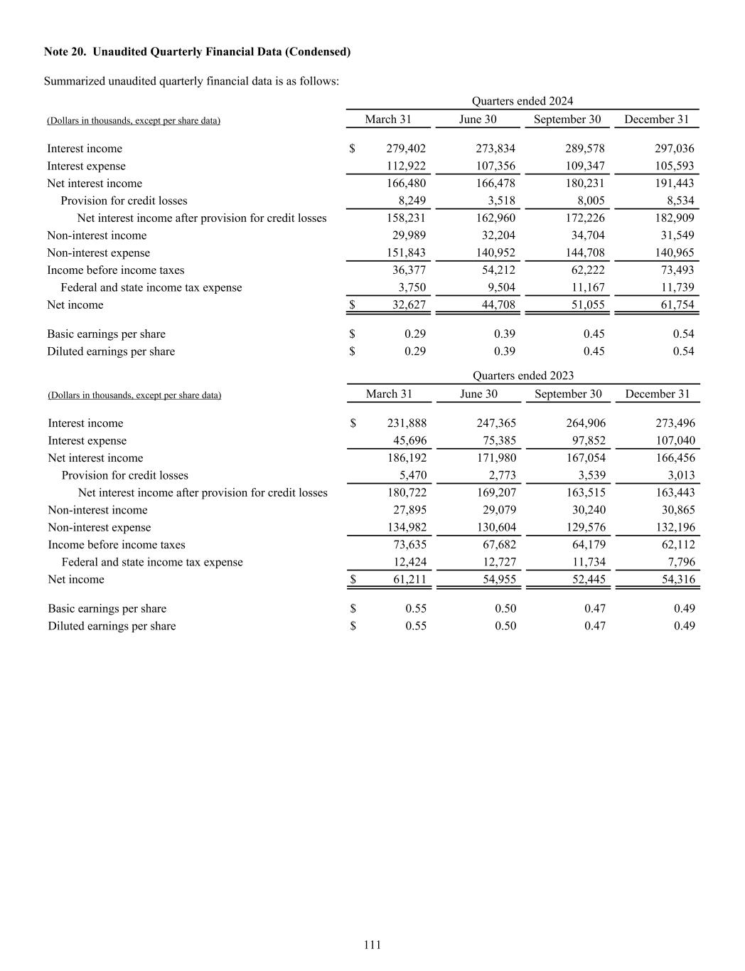 Note 20. Unaudited Quarterly Financial Data (Condensed) Summarized unaudited quarterly financial data is as follows: Quarters ended 2024 (Dollars in thousands, except per share data) March 31 June 30 September 30 December 31 Interest income $ 279,402 273,834 289,578 297,036 Interest expense 112,922 107,356 109,347 105,593 Net interest income 166,480 166,478 180,231 191,443 Provision for credit losses 8,249 3,518 8,005 8,534 Net interest income after provision for credit losses 158,231 162,960 172,226 182,909 Non-interest income 29,989 32,204 34,704 31,549 Non-interest expense 151,843 140,952 144,708 140,965 Income before income taxes 36,377 54,212 62,222 73,493 Federal and state income tax expense 3,750 9,504 11,167 11,739 Net income $ 32,627 44,708 51,055 61,754 Basic earnings per share $ 0.29 0.39 0.45 0.54 Diluted earnings per share $ 0.29 0.39 0.45 0.54 Quarters ended 2023 (Dollars in thousands, except per share data) March 31 June 30 September 30 December 31 Interest income $ 231,888 247,365 264,906 273,496 Interest expense 45,696 75,385 97,852 107,040 Net interest income 186,192 171,980 167,054 166,456 Provision for credit losses 5,470 2,773 3,539 3,013 Net interest income after provision for credit losses 180,722 169,207 163,515 163,443 Non-interest income 27,895 29,079 30,240 30,865 Non-interest expense 134,982 130,604 129,576 132,196 Income before income taxes 73,635 67,682 64,179 62,112 Federal and state income tax expense 12,424 12,727 11,734 7,796 Net income $ 61,211 54,955 52,445 54,316 Basic earnings per share $ 0.55 0.50 0.47 0.49 Diluted earnings per share $ 0.55 0.50 0.47 0.49 111