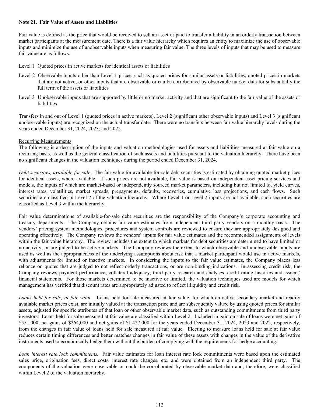 Note 21. Fair Value of Assets and Liabilities Fair value is defined as the price that would be received to sell an asset or paid to transfer a liability in an orderly transaction between market participants at the measurement date. There is a fair value hierarchy which requires an entity to maximize the use of observable inputs and minimize the use of unobservable inputs when measuring fair value. The three levels of inputs that may be used to measure fair value are as follows: Level 1 Quoted prices in active markets for identical assets or liabilities Level 2 Observable inputs other than Level 1 prices, such as quoted prices for similar assets or liabilities; quoted prices in markets that are not active; or other inputs that are observable or can be corroborated by observable market data for substantially the full term of the assets or liabilities Level 3 Unobservable inputs that are supported by little or no market activity and that are significant to the fair value of the assets or liabilities Transfers in and out of Level 1 (quoted prices in active markets), Level 2 (significant other observable inputs) and Level 3 (significant unobservable inputs) are recognized on the actual transfer date. There were no transfers between fair value hierarchy levels during the years ended December 31, 2024, 2023, and 2022. Recurring Measurements The following is a description of the inputs and valuation methodologies used for assets and liabilities measured at fair value on a recurring basis, as well as the general classification of such assets and liabilities pursuant to the valuation hierarchy. There have been no significant changes in the valuation techniques during the period ended December 31, 2024. Debt securities, available-for-sale. The fair value for available-for-sale debt securities is estimated by obtaining quoted market prices for identical assets, where available. If such prices are not available, fair value is based on independent asset pricing services and models, the inputs of which are market-based or independently sourced market parameters, including but not limited to, yield curves, interest rates, volatilities, market spreads, prepayments, defaults, recoveries, cumulative loss projections, and cash flows. Such securities are classified in Level 2 of the valuation hierarchy. Where Level 1 or Level 2 inputs are not available, such securities are classified as Level 3 within the hierarchy. Fair value determinations of available-for-sale debt securities are the responsibility of the Company’s corporate accounting and treasury departments. The Company obtains fair value estimates from independent third party vendors on a monthly basis. The vendors’ pricing system methodologies, procedures and system controls are reviewed to ensure they are appropriately designed and operating effectively. The Company reviews the vendors’ inputs for fair value estimates and the recommended assignments of levels within the fair value hierarchy. The review includes the extent to which markets for debt securities are determined to have limited or no activity, or are judged to be active markets. The Company reviews the extent to which observable and unobservable inputs are used as well as the appropriateness of the underlying assumptions about risk that a market participant would use in active markets, with adjustments for limited or inactive markets. In considering the inputs to the fair value estimates, the Company places less reliance on quotes that are judged to not reflect orderly transactions, or are non-binding indications. In assessing credit risk, the Company reviews payment performance, collateral adequacy, third party research and analyses, credit rating histories and issuers’ financial statements. For those markets determined to be inactive or limited, the valuation techniques used are models for which management has verified that discount rates are appropriately adjusted to reflect illiquidity and credit risk. Loans held for sale, at fair value. Loans held for sale measured at fair value, for which an active secondary market and readily available market prices exist, are initially valued at the transaction price and are subsequently valued by using quoted prices for similar assets, adjusted for specific attributes of that loan or other observable market data, such as outstanding commitments from third party investors. Loans held for sale measured at fair value are classified within Level 2. Included in gain on sale of loans were net gains of $551,000, net gains of $264,000 and net gains of $1,427,000 for the years ended December 31, 2024, 2023 and 2022, respectively, from the changes in fair value of loans held for sale measured at fair value. Electing to measure loans held for sale at fair value reduces certain timing differences and better matches changes in fair value of these assets with changes in the value of the derivative instruments used to economically hedge them without the burden of complying with the requirements for hedge accounting. Loan interest rate lock commitments. Fair value estimates for loan interest rate lock commitments were based upon the estimated sales price, origination fees, direct costs, interest rate changes, etc. and were obtained from an independent third party. The components of the valuation were observable or could be corroborated by observable market data and, therefore, were classified within Level 2 of the valuation hierarchy. 112