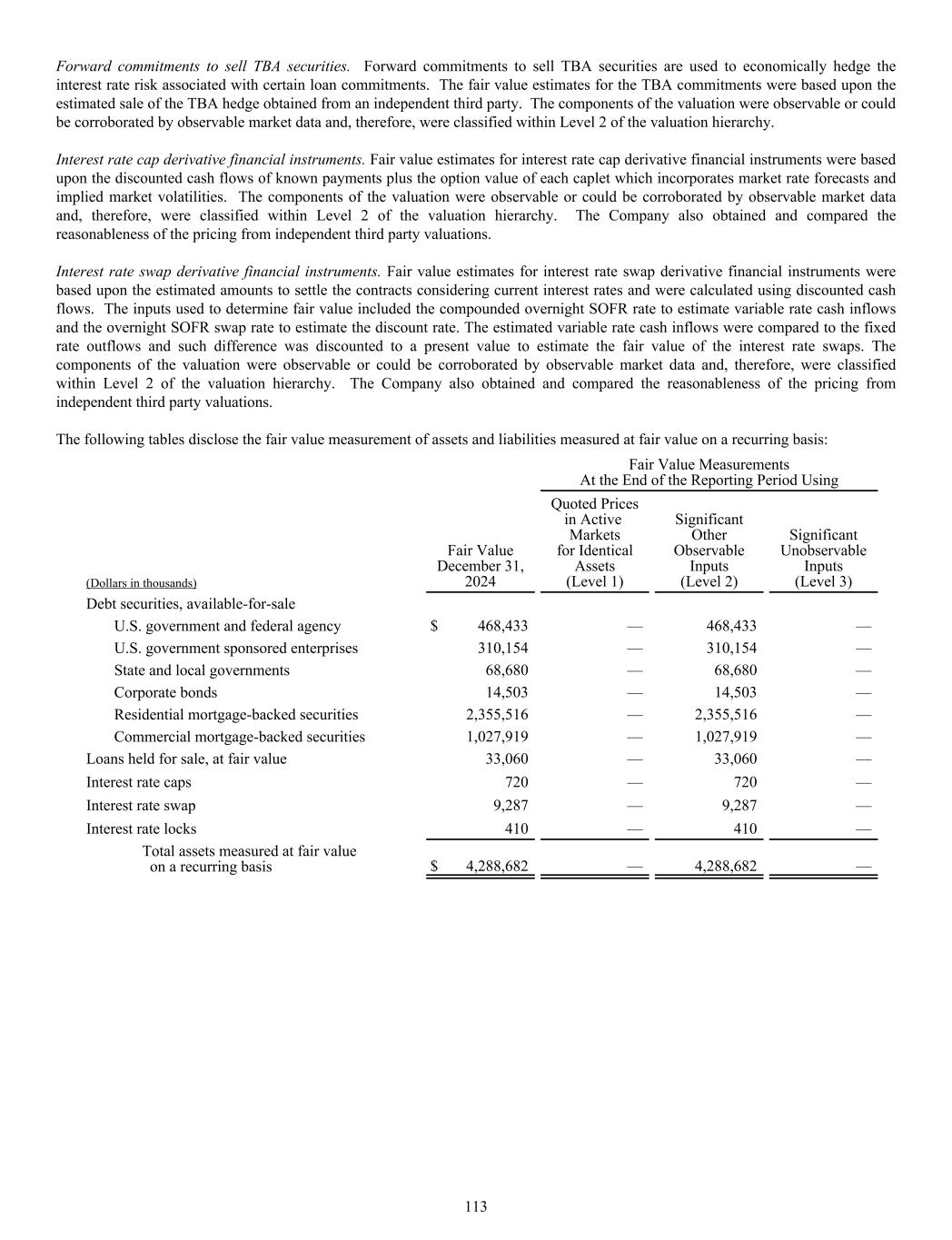 Forward commitments to sell TBA securities. Forward commitments to sell TBA securities are used to economically hedge the interest rate risk associated with certain loan commitments. The fair value estimates for the TBA commitments were based upon the estimated sale of the TBA hedge obtained from an independent third party. The components of the valuation were observable or could be corroborated by observable market data and, therefore, were classified within Level 2 of the valuation hierarchy. Interest rate cap derivative financial instruments. Fair value estimates for interest rate cap derivative financial instruments were based upon the discounted cash flows of known payments plus the option value of each caplet which incorporates market rate forecasts and implied market volatilities. The components of the valuation were observable or could be corroborated by observable market data and, therefore, were classified within Level 2 of the valuation hierarchy. The Company also obtained and compared the reasonableness of the pricing from independent third party valuations. Interest rate swap derivative financial instruments. Fair value estimates for interest rate swap derivative financial instruments were based upon the estimated amounts to settle the contracts considering current interest rates and were calculated using discounted cash flows. The inputs used to determine fair value included the compounded overnight SOFR rate to estimate variable rate cash inflows and the overnight SOFR swap rate to estimate the discount rate. The estimated variable rate cash inflows were compared to the fixed rate outflows and such difference was discounted to a present value to estimate the fair value of the interest rate swaps. The components of the valuation were observable or could be corroborated by observable market data and, therefore, were classified within Level 2 of the valuation hierarchy. The Company also obtained and compared the reasonableness of the pricing from independent third party valuations. The following tables disclose the fair value measurement of assets and liabilities measured at fair value on a recurring basis: Fair Value Measurements At the End of the Reporting Period Using (Dollars in thousands) Fair Value December 31, 2024 Quoted Prices in Active Markets for Identical Assets (Level 1) Significant Other Observable Inputs (Level 2) Significant Unobservable Inputs (Level 3) Debt securities, available-for-sale U.S. government and federal agency $ 468,433 — 468,433 — U.S. government sponsored enterprises 310,154 — 310,154 — State and local governments 68,680 — 68,680 — Corporate bonds 14,503 — 14,503 — Residential mortgage-backed securities 2,355,516 — 2,355,516 — Commercial mortgage-backed securities 1,027,919 — 1,027,919 — Loans held for sale, at fair value 33,060 — 33,060 — Interest rate caps 720 — 720 — Interest rate swap 9,287 — 9,287 — Interest rate locks 410 — 410 — Total assets measured at fair value on a recurring basis $ 4,288,682 — 4,288,682 — 113