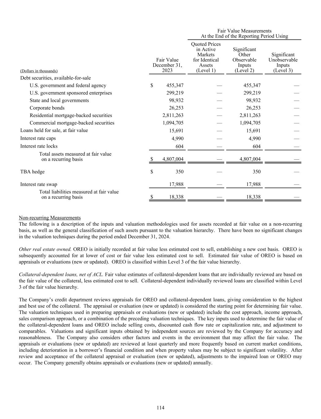 Fair Value Measurements At the End of the Reporting Period Using (Dollars in thousands) Fair Value December 31, 2023 Quoted Prices in Active Markets for Identical Assets (Level 1) Significant Other Observable Inputs (Level 2) Significant Unobservable Inputs (Level 3) Debt securities, available-for-sale U.S. government and federal agency $ 455,347 — 455,347 — U.S. government sponsored enterprises 299,219 — 299,219 — State and local governments 98,932 — 98,932 — Corporate bonds 26,253 — 26,253 — Residential mortgage-backed securities 2,811,263 — 2,811,263 — Commercial mortgage-backed securities 1,094,705 — 1,094,705 — Loans held for sale, at fair value 15,691 — 15,691 — Interest rate caps 4,990 — 4,990 — Interest rate locks 604 — 604 — Total assets measured at fair value on a recurring basis $ 4,807,004 — 4,807,004 — TBA hedge $ 350 — 350 — Interest rate swap 17,988 — 17,988 — Total liabilities measured at fair value on a recurring basis $ 18,338 — 18,338 — Non-recurring Measurements The following is a description of the inputs and valuation methodologies used for assets recorded at fair value on a non-recurring basis, as well as the general classification of such assets pursuant to the valuation hierarchy. There have been no significant changes in the valuation techniques during the period ended December 31, 2024. Other real estate owned. OREO is initially recorded at fair value less estimated cost to sell, establishing a new cost basis. OREO is subsequently accounted for at lower of cost or fair value less estimated cost to sell. Estimated fair value of OREO is based on appraisals or evaluations (new or updated). OREO is classified within Level 3 of the fair value hierarchy. Collateral-dependent loans, net of ACL. Fair value estimates of collateral-dependent loans that are individually reviewed are based on the fair value of the collateral, less estimated cost to sell. Collateral-dependent individually reviewed loans are classified within Level 3 of the fair value hierarchy. The Company’s credit department reviews appraisals for OREO and collateral-dependent loans, giving consideration to the highest and best use of the collateral. The appraisal or evaluation (new or updated) is considered the starting point for determining fair value. The valuation techniques used in preparing appraisals or evaluations (new or updated) include the cost approach, income approach, sales comparison approach, or a combination of the preceding valuation techniques. The key inputs used to determine the fair value of the collateral-dependent loans and OREO include selling costs, discounted cash flow rate or capitalization rate, and adjustment to comparables. Valuations and significant inputs obtained by independent sources are reviewed by the Company for accuracy and reasonableness. The Company also considers other factors and events in the environment that may affect the fair value. The appraisals or evaluations (new or updated) are reviewed at least quarterly and more frequently based on current market conditions, including deterioration in a borrower’s financial condition and when property values may be subject to significant volatility. After review and acceptance of the collateral appraisal or evaluation (new or updated), adjustments to the impaired loan or OREO may occur. The Company generally obtains appraisals or evaluations (new or updated) annually. 114