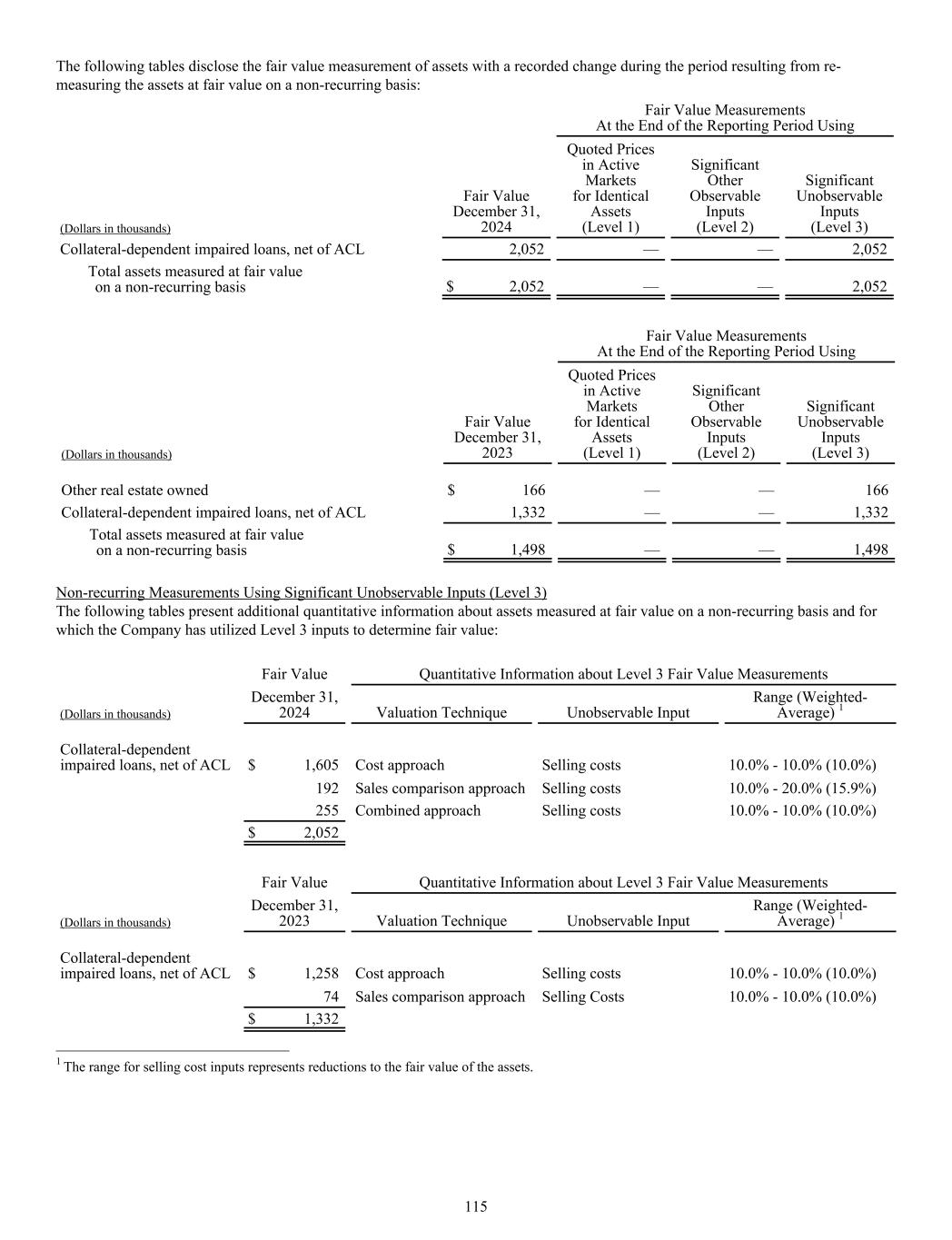 The following tables disclose the fair value measurement of assets with a recorded change during the period resulting from re- measuring the assets at fair value on a non-recurring basis: Fair Value Measurements At the End of the Reporting Period Using (Dollars in thousands) Fair Value December 31, 2024 Quoted Prices in Active Markets for Identical Assets (Level 1) Significant Other Observable Inputs (Level 2) Significant Unobservable Inputs (Level 3) Collateral-dependent impaired loans, net of ACL 2,052 — — 2,052 Total assets measured at fair value on a non-recurring basis $ 2,052 — — 2,052 Fair Value Measurements At the End of the Reporting Period Using (Dollars in thousands) Fair Value December 31, 2023 Quoted Prices in Active Markets for Identical Assets (Level 1) Significant Other Observable Inputs (Level 2) Significant Unobservable Inputs (Level 3) Other real estate owned $ 166 — — 166 Collateral-dependent impaired loans, net of ACL 1,332 — — 1,332 Total assets measured at fair value on a non-recurring basis $ 1,498 — — 1,498 Non-recurring Measurements Using Significant Unobservable Inputs (Level 3) The following tables present additional quantitative information about assets measured at fair value on a non-recurring basis and for which the Company has utilized Level 3 inputs to determine fair value: Fair Value Quantitative Information about Level 3 Fair Value Measurements (Dollars in thousands) December 31, 2024 Valuation Technique Unobservable Input Range (Weighted- Average) 1 Collateral-dependent impaired loans, net of ACL $ 1,605 Cost approach Selling costs 10.0% - 10.0% (10.0%) 192 Sales comparison approach Selling costs 10.0% - 20.0% (15.9%) 255 Combined approach Selling costs 10.0% - 10.0% (10.0%) $ 2,052 Fair Value Quantitative Information about Level 3 Fair Value Measurements (Dollars in thousands) December 31, 2023 Valuation Technique Unobservable Input Range (Weighted- Average) 1 Collateral-dependent impaired loans, net of ACL $ 1,258 Cost approach Selling costs 10.0% - 10.0% (10.0%) 74 Sales comparison approach Selling Costs 10.0% - 10.0% (10.0%) $ 1,332 ______________________________ 1 The range for selling cost inputs represents reductions to the fair value of the assets. 115