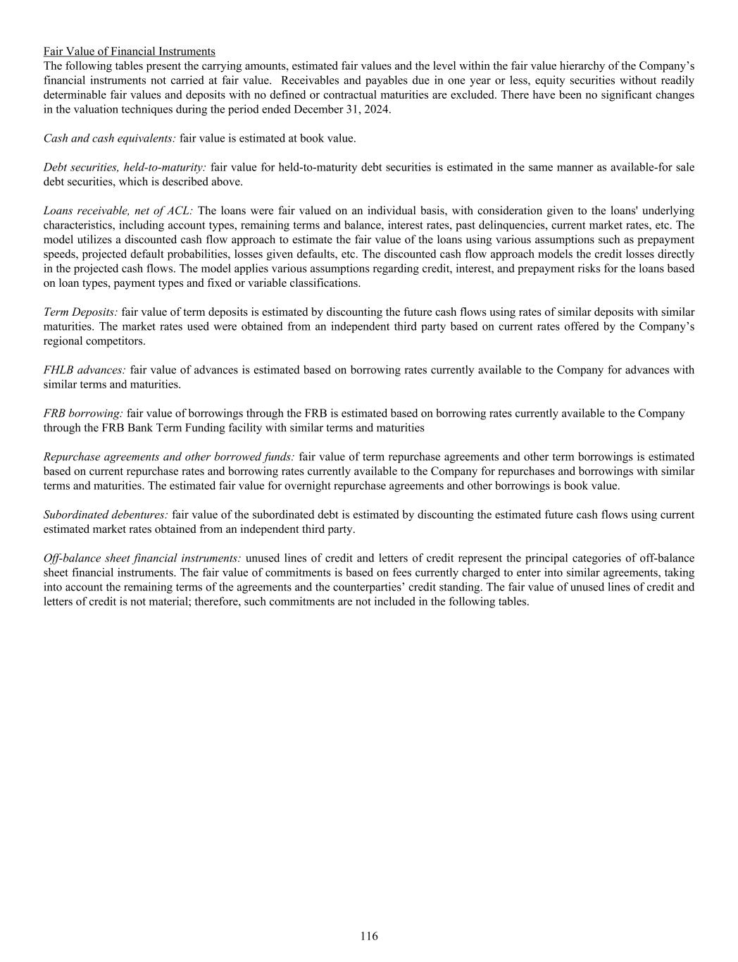 Fair Value of Financial Instruments The following tables present the carrying amounts, estimated fair values and the level within the fair value hierarchy of the Company’s financial instruments not carried at fair value. Receivables and payables due in one year or less, equity securities without readily determinable fair values and deposits with no defined or contractual maturities are excluded. There have been no significant changes in the valuation techniques during the period ended December 31, 2024. Cash and cash equivalents: fair value is estimated at book value. Debt securities, held-to-maturity: fair value for held-to-maturity debt securities is estimated in the same manner as available-for sale debt securities, which is described above. Loans receivable, net of ACL: The loans were fair valued on an individual basis, with consideration given to the loans' underlying characteristics, including account types, remaining terms and balance, interest rates, past delinquencies, current market rates, etc. The model utilizes a discounted cash flow approach to estimate the fair value of the loans using various assumptions such as prepayment speeds, projected default probabilities, losses given defaults, etc. The discounted cash flow approach models the credit losses directly in the projected cash flows. The model applies various assumptions regarding credit, interest, and prepayment risks for the loans based on loan types, payment types and fixed or variable classifications. Term Deposits: fair value of term deposits is estimated by discounting the future cash flows using rates of similar deposits with similar maturities. The market rates used were obtained from an independent third party based on current rates offered by the Company’s regional competitors. FHLB advances: fair value of advances is estimated based on borrowing rates currently available to the Company for advances with similar terms and maturities. FRB borrowing: fair value of borrowings through the FRB is estimated based on borrowing rates currently available to the Company through the FRB Bank Term Funding facility with similar terms and maturities Repurchase agreements and other borrowed funds: fair value of term repurchase agreements and other term borrowings is estimated based on current repurchase rates and borrowing rates currently available to the Company for repurchases and borrowings with similar terms and maturities. The estimated fair value for overnight repurchase agreements and other borrowings is book value. Subordinated debentures: fair value of the subordinated debt is estimated by discounting the estimated future cash flows using current estimated market rates obtained from an independent third party. Off-balance sheet financial instruments: unused lines of credit and letters of credit represent the principal categories of off-balance sheet financial instruments. The fair value of commitments is based on fees currently charged to enter into similar agreements, taking into account the remaining terms of the agreements and the counterparties’ credit standing. The fair value of unused lines of credit and letters of credit is not material; therefore, such commitments are not included in the following tables. 116