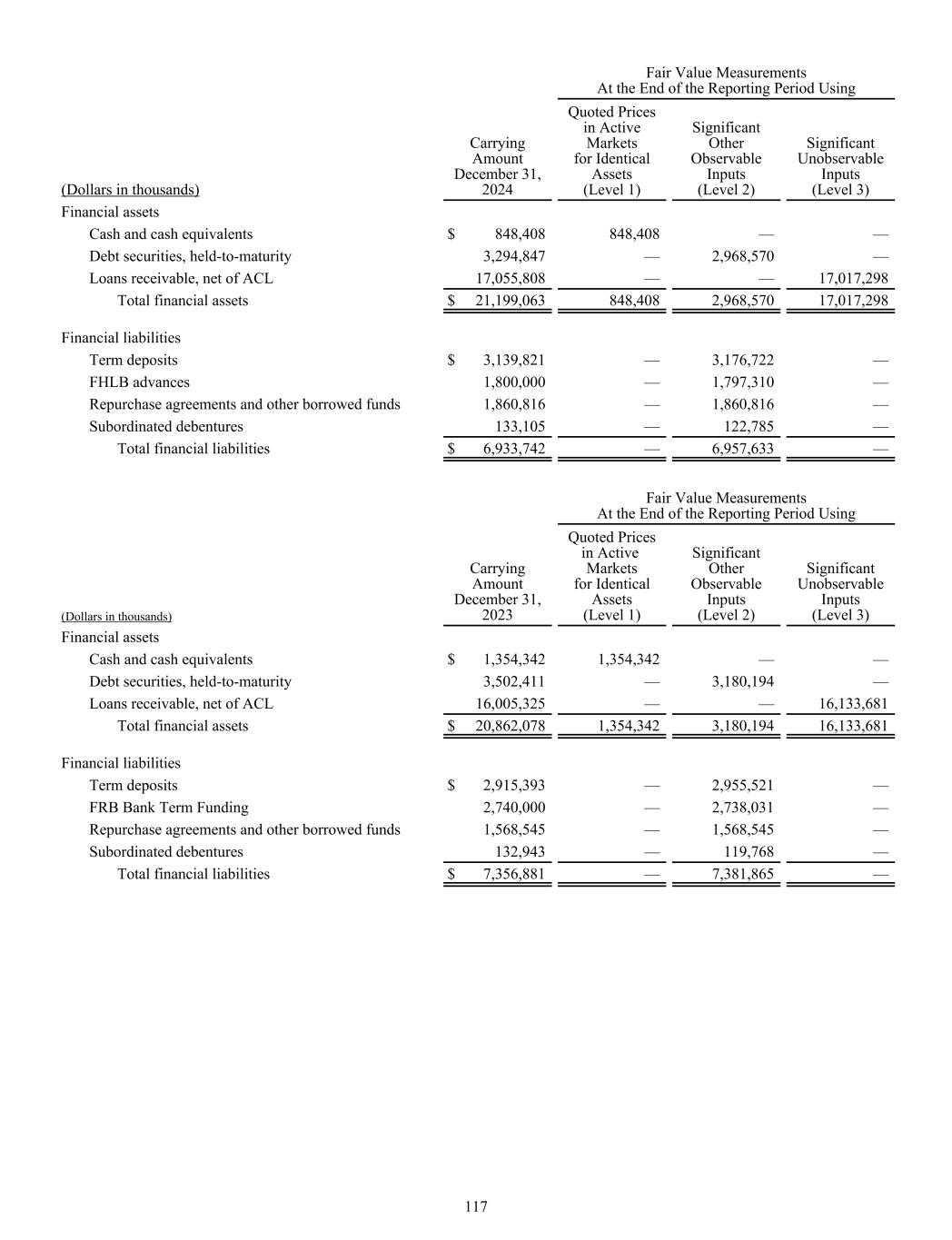 Fair Value Measurements At the End of the Reporting Period Using (Dollars in thousands) Carrying Amount December 31, 2024 Quoted Prices in Active Markets for Identical Assets (Level 1) Significant Other Observable Inputs (Level 2) Significant Unobservable Inputs (Level 3) Financial assets Cash and cash equivalents $ 848,408 848,408 — — Debt securities, held-to-maturity 3,294,847 — 2,968,570 — Loans receivable, net of ACL 17,055,808 — — 17,017,298 Total financial assets $ 21,199,063 848,408 2,968,570 17,017,298 Financial liabilities Term deposits $ 3,139,821 — 3,176,722 — FHLB advances 1,800,000 — 1,797,310 — Repurchase agreements and other borrowed funds 1,860,816 — 1,860,816 — Subordinated debentures 133,105 — 122,785 — Total financial liabilities $ 6,933,742 — 6,957,633 — Fair Value Measurements At the End of the Reporting Period Using (Dollars in thousands) Carrying Amount December 31, 2023 Quoted Prices in Active Markets for Identical Assets (Level 1) Significant Other Observable Inputs (Level 2) Significant Unobservable Inputs (Level 3) Financial assets Cash and cash equivalents $ 1,354,342 1,354,342 — — Debt securities, held-to-maturity 3,502,411 — 3,180,194 — Loans receivable, net of ACL 16,005,325 — — 16,133,681 Total financial assets $ 20,862,078 1,354,342 3,180,194 16,133,681 Financial liabilities Term deposits $ 2,915,393 — 2,955,521 — FRB Bank Term Funding 2,740,000 — 2,738,031 — Repurchase agreements and other borrowed funds 1,568,545 — 1,568,545 — Subordinated debentures 132,943 — 119,768 — Total financial liabilities $ 7,356,881 — 7,381,865 — 117