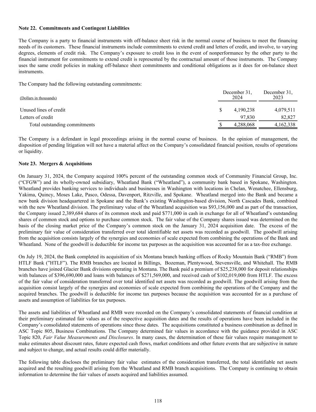 Note 22. Commitments and Contingent Liabilities The Company is a party to financial instruments with off-balance sheet risk in the normal course of business to meet the financing needs of its customers. These financial instruments include commitments to extend credit and letters of credit, and involve, to varying degrees, elements of credit risk. The Company’s exposure to credit loss in the event of nonperformance by the other party to the financial instrument for commitments to extend credit is represented by the contractual amount of those instruments. The Company uses the same credit policies in making off-balance sheet commitments and conditional obligations as it does for on-balance sheet instruments. The Company had the following outstanding commitments: (Dollars in thousands) December 31, 2024 December 31, 2023 Unused lines of credit $ 4,190,238 4,079,511 Letters of credit 97,830 82,827 Total outstanding commitments $ 4,288,068 4,162,338 The Company is a defendant in legal proceedings arising in the normal course of business. In the opinion of management, the disposition of pending litigation will not have a material affect on the Company’s consolidated financial position, results of operations or liquidity. Note 23. Mergers & Acquisitions On January 31, 2024, the Company acquired 100% percent of the outstanding common stock of Community Financial Group, Inc. (“CFGW”) and its wholly-owned subsidiary, Wheatland Bank (“Wheatland”), a community bank based in Spokane, Washington. Wheatland provides banking services to individuals and businesses in Washington with locations in Chelan, Wenatchee, Ellensburg, Yakima, Quincy, Moses Lake, Pasco, Odessa, Davenport, Ritzville, and Spokane. Wheatland merged into the Bank and became a new bank division headquartered in Spokane and the Bank’s existing Washington-based division, North Cascades Bank, combined with the new Wheatland division. The preliminary value of the Wheatland acquisition was $93,156,000 and as part of the transaction, the Company issued 2,389,684 shares of its common stock and paid $771,000 in cash in exchange for all of Wheatland’s outstanding shares of common stock and options to purchase common stock. The fair value of the Company shares issued was determined on the basis of the closing market price of the Company’s common stock on the January 31, 2024 acquisition date. The excess of the preliminary fair value of consideration transferred over total identifiable net assets was recorded as goodwill. The goodwill arising from the acquisition consists largely of the synergies and economies of scale expected from combining the operations of the Bank and Wheatland. None of the goodwill is deductible for income tax purposes as the acquisition was accounted for as a tax-free exchange. On July 19, 2024, the Bank completed its acquisition of six Montana branch banking offices of Rocky Mountain Bank (“RMB”) from HTLF Bank (”HTLF”). The RMB branches are located in Billings, Bozeman, Plentywood, Stevensville, and Whitehall. The RMB branches have joined Glacier Bank divisions operating in Montana. The Bank paid a premium of $25,238,000 for deposit relationships with balances of $396,690,000 and loans with balances of $271,569,000, and received cash of $102,019,000 from HTLF. The excess of the fair value of consideration transferred over total identified net assets was recorded as goodwill. The goodwill arising from the acquisition consist largely of the synergies and economies of scale expected from combining the operations of the Company and the acquired branches. The goodwill is deductible for income tax purposes because the acquisition was accounted for as a purchase of assets and assumption of liabilities for tax purposes. The assets and liabilities of Wheatland and RMB were recorded on the Company’s consolidated statements of financial condition at their preliminary estimated fair values as of the respective acquisition dates and the results of operations have been included in the Company’s consolidated statements of operations since those dates. The acquisitions constituted a business combination as defined in ASC Topic 805, Business Combinations. The Company determined fair values in accordance with the guidance provided in ASC Topic 820, Fair Value Measurements and Disclosures. In many cases, the determination of these fair values require management to make estimates about discount rates, future expected cash flows, market conditions and other future events that are subjective in nature and subject to change, and actual results could differ materially. The following table discloses the preliminary fair value estimates of the consideration transferred, the total identifiable net assets acquired and the resulting goodwill arising from the Wheatland and RMB branch acquisitions. The Company is continuing to obtain information to determine the fair values of assets acquired and liabilities assumed. 118