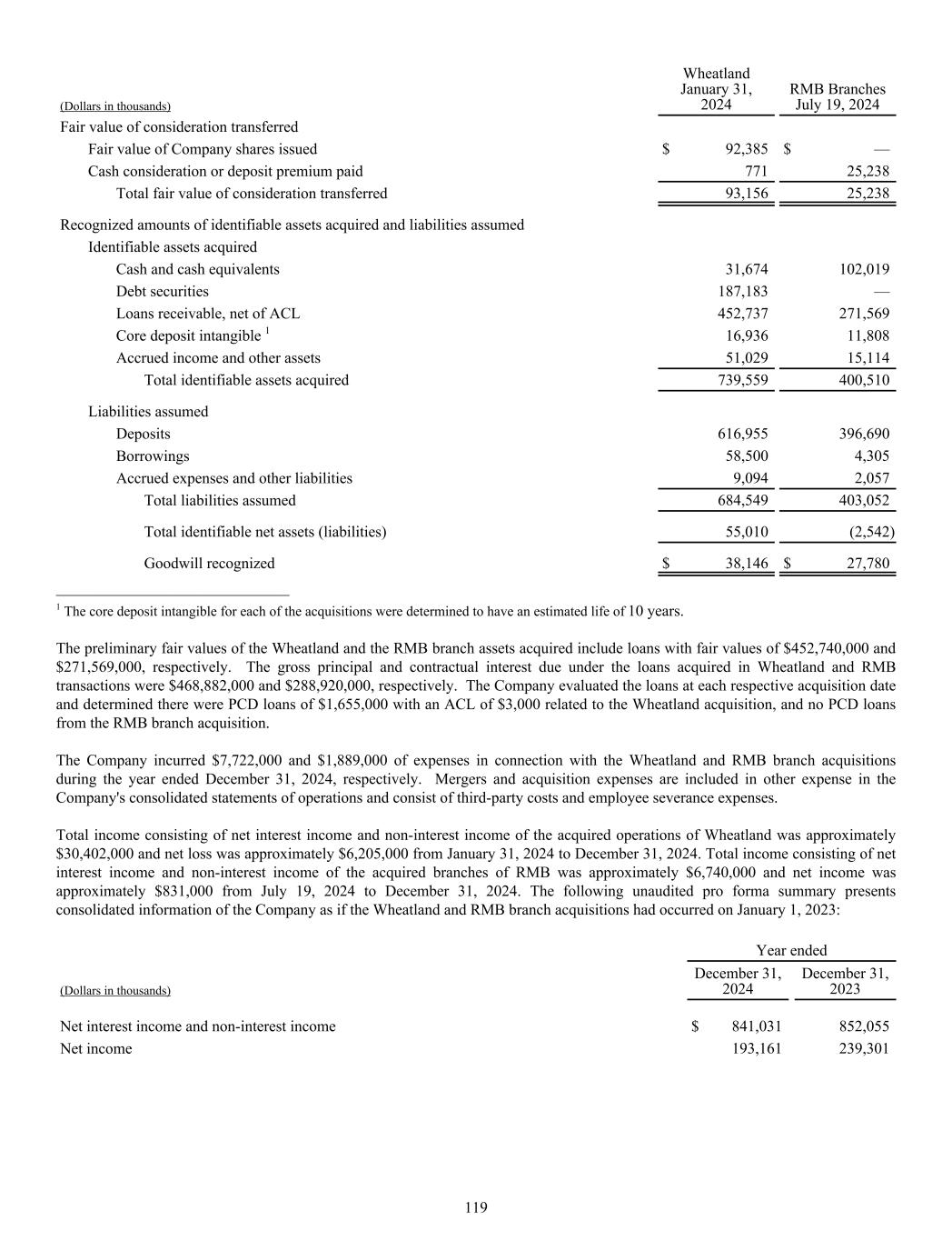 (Dollars in thousands) Wheatland January 31, 2024 RMB Branches July 19, 2024 Fair value of consideration transferred Fair value of Company shares issued $ 92,385 $ — Cash consideration or deposit premium paid 771 25,238 Total fair value of consideration transferred 93,156 25,238 Recognized amounts of identifiable assets acquired and liabilities assumed Identifiable assets acquired Cash and cash equivalents 31,674 102,019 Debt securities 187,183 — Loans receivable, net of ACL 452,737 271,569 Core deposit intangible 1 16,936 11,808 Accrued income and other assets 51,029 15,114 Total identifiable assets acquired 739,559 400,510 Liabilities assumed Deposits 616,955 396,690 Borrowings 58,500 4,305 Accrued expenses and other liabilities 9,094 2,057 Total liabilities assumed 684,549 403,052 Total identifiable net assets (liabilities) 55,010 (2,542) Goodwill recognized $ 38,146 $ 27,780 ______________________________ 1 The core deposit intangible for each of the acquisitions were determined to have an estimated life of 10 years. The preliminary fair values of the Wheatland and the RMB branch assets acquired include loans with fair values of $452,740,000 and $271,569,000, respectively. The gross principal and contractual interest due under the loans acquired in Wheatland and RMB transactions were $468,882,000 and $288,920,000, respectively. The Company evaluated the loans at each respective acquisition date and determined there were PCD loans of $1,655,000 with an ACL of $3,000 related to the Wheatland acquisition, and no PCD loans from the RMB branch acquisition. The Company incurred $7,722,000 and $1,889,000 of expenses in connection with the Wheatland and RMB branch acquisitions during the year ended December 31, 2024, respectively. Mergers and acquisition expenses are included in other expense in the Company's consolidated statements of operations and consist of third-party costs and employee severance expenses. Total income consisting of net interest income and non-interest income of the acquired operations of Wheatland was approximately $30,402,000 and net loss was approximately $6,205,000 from January 31, 2024 to December 31, 2024. Total income consisting of net interest income and non-interest income of the acquired branches of RMB was approximately $6,740,000 and net income was approximately $831,000 from July 19, 2024 to December 31, 2024. The following unaudited pro forma summary presents consolidated information of the Company as if the Wheatland and RMB branch acquisitions had occurred on January 1, 2023: Year ended (Dollars in thousands) December 31, 2024 December 31, 2023 Net interest income and non-interest income $ 841,031 852,055 Net income 193,161 239,301 119