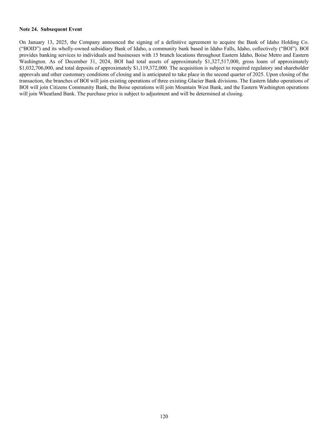 Note 24. Subsequent Event On January 13, 2025, the Company announced the signing of a definitive agreement to acquire the Bank of Idaho Holding Co. (“BOID”) and its wholly-owned subsidiary Bank of Idaho, a community bank based in Idaho Falls, Idaho, collectively (“BOI”). BOI provides banking services to individuals and businesses with 15 branch locations throughout Eastern Idaho, Boise Metro and Eastern Washington. As of December 31, 2024, BOI had total assets of approximately $1,327,517,000, gross loans of approximately $1,032,706,000, and total deposits of approximately $1,119,372,000. The acquisition is subject to required regulatory and shareholder approvals and other customary conditions of closing and is anticipated to take place in the second quarter of 2025. Upon closing of the transaction, the branches of BOI will join existing operations of three existing Glacier Bank divisions. The Eastern Idaho operations of BOI will join Citizens Community Bank, the Boise operations will join Mountain West Bank, and the Eastern Washington operations will join Wheatland Bank. The purchase price is subject to adjustment and will be determined at closing. 120