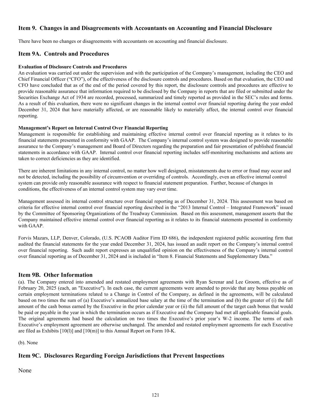 Item 9. Changes in and Disagreements with Accountants on Accounting and Financial Disclosure There have been no changes or disagreements with accountants on accounting and financial disclosure. Item 9A. Controls and Procedures Evaluation of Disclosure Controls and Procedures An evaluation was carried out under the supervision and with the participation of the Company’s management, including the CEO and Chief Financial Officer (“CFO”), of the effectiveness of the disclosure controls and procedures. Based on that evaluation, the CEO and CFO have concluded that as of the end of the period covered by this report, the disclosure controls and procedures are effective to provide reasonable assurance that information required to be disclosed by the Company in reports that are filed or submitted under the Securities Exchange Act of 1934 are recorded, processed, summarized and timely reported as provided in the SEC’s rules and forms. As a result of this evaluation, there were no significant changes in the internal control over financial reporting during the year ended December 31, 2024 that have materially affected, or are reasonable likely to materially affect, the internal control over financial reporting. Management’s Report on Internal Control Over Financial Reporting Management is responsible for establishing and maintaining effective internal control over financial reporting as it relates to its financial statements presented in conformity with GAAP. The Company’s internal control system was designed to provide reasonable assurance to the Company’s management and Board of Directors regarding the preparation and fair presentation of published financial statements in accordance with GAAP. Internal control over financial reporting includes self-monitoring mechanisms and actions are taken to correct deficiencies as they are identified. There are inherent limitations in any internal control, no matter how well designed, misstatements due to error or fraud may occur and not be detected, including the possibility of circumvention or overriding of controls. Accordingly, even an effective internal control system can provide only reasonable assurance with respect to financial statement preparation. Further, because of changes in conditions, the effectiveness of an internal control system may vary over time. Management assessed its internal control structure over financial reporting as of December 31, 2024. This assessment was based on criteria for effective internal control over financial reporting described in the “2013 Internal Control – Integrated Framework” issued by the Committee of Sponsoring Organizations of the Treadway Commission. Based on this assessment, management asserts that the Company maintained effective internal control over financial reporting as it relates to its financial statements presented in conformity with GAAP. Forvis Mazars, LLP, Denver, Colorado, (U.S. PCAOB Auditor Firm ID 686), the independent registered public accounting firm that audited the financial statements for the year ended December 31, 2024, has issued an audit report on the Company’s internal control over financial reporting. Such audit report expresses an unqualified opinion on the effectiveness of the Company’s internal control over financial reporting as of December 31, 2024 and is included in “Item 8. Financial Statements and Supplementary Data.” Item 9B. Other Information (a). The Company entered into amended and restated employment agreements with Ryan Screnar and Lee Groom, effective as of February 20, 2025 (each, an "Executive"). In each case, the current agreements were amended to provide that any bonus payable on certain employment terminations related to a Change in Control of the Company, as defined in the agreements, will be calculated based on two times the sum of (a) Executive’s annualized base salary at the time of the termination and (b) the greater of (i) the full amount of the cash bonus earned by the Executive in the prior calendar year or (ii) the full amount of the target cash bonus that would be paid or payable in the year in which the termination occurs as if Executive and the Company had met all applicable financial goals. The original agreements had based the calculation on two times the Executive’s prior year’s W-2 income. The terms of each Executive’s employment agreement are otherwise unchanged. The amended and restated employment agreements for each Executive are filed as Exhibits [10(l)] and [10(m)] to this Annual Report on Form 10-K. (b). None Item 9C. Disclosures Regarding Foreign Jurisdictions that Prevent Inspections None 121