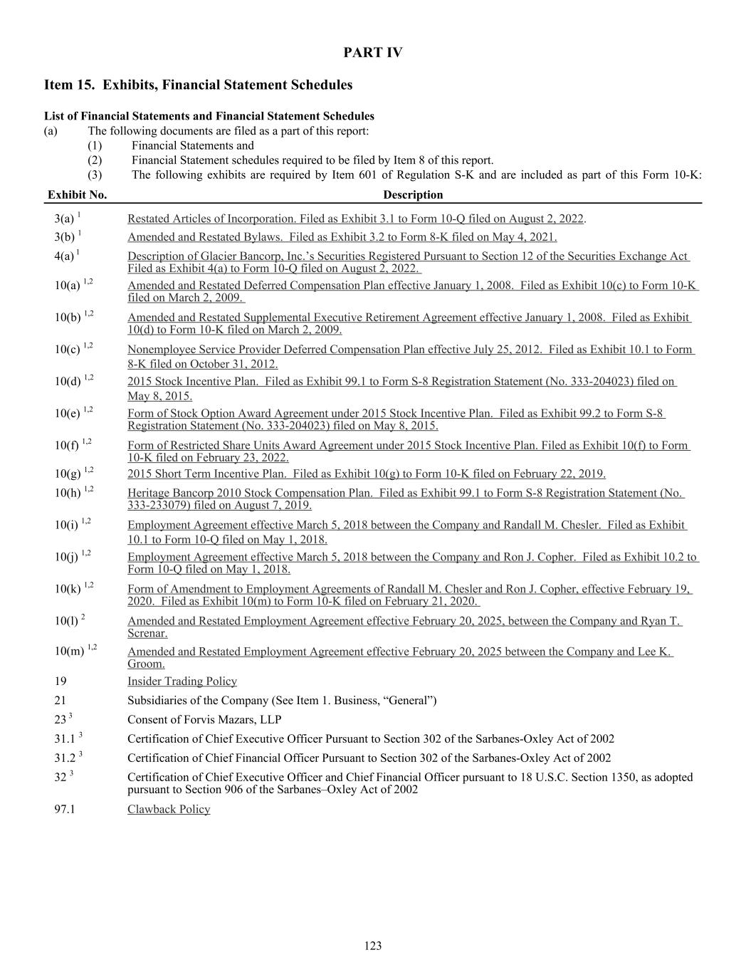 PART IV Item 15. Exhibits, Financial Statement Schedules List of Financial Statements and Financial Statement Schedules (a) The following documents are filed as a part of this report: (1) Financial Statements and (2) Financial Statement schedules required to be filed by Item 8 of this report. (3) The following exhibits are required by Item 601 of Regulation S-K and are included as part of this Form 10-K: Exhibit No. Description 3(a) 1 Restated Articles of Incorporation. Filed as Exhibit 3.1 to Form 10-Q filed on August 2, 2022. 3(b) 1 Amended and Restated Bylaws. Filed as Exhibit 3.2 to Form 8-K filed on May 4, 2021. 4(a) 1 Description of Glacier Bancorp, Inc.’s Securities Registered Pursuant to Section 12 of the Securities Exchange Act Filed as Exhibit 4(a) to Form 10-Q filed on August 2, 2022. 10(a) 1,2 Amended and Restated Deferred Compensation Plan effective January 1, 2008. Filed as Exhibit 10(c) to Form 10-K filed on March 2, 2009. 10(b) 1,2 Amended and Restated Supplemental Executive Retirement Agreement effective January 1, 2008. Filed as Exhibit 10(d) to Form 10-K filed on March 2, 2009. 10(c) 1,2 Nonemployee Service Provider Deferred Compensation Plan effective July 25, 2012. Filed as Exhibit 10.1 to Form 8-K filed on October 31, 2012. 10(d) 1,2 2015 Stock Incentive Plan. Filed as Exhibit 99.1 to Form S-8 Registration Statement (No. 333-204023) filed on May 8, 2015. 10(e) 1,2 Form of Stock Option Award Agreement under 2015 Stock Incentive Plan. Filed as Exhibit 99.2 to Form S-8 Registration Statement (No. 333-204023) filed on May 8, 2015. 10(f) 1,2 Form of Restricted Share Units Award Agreement under 2015 Stock Incentive Plan. Filed as Exhibit 10(f) to Form 10-K filed on February 23, 2022. 10(g) 1,2 2015 Short Term Incentive Plan. Filed as Exhibit 10(g) to Form 10-K filed on February 22, 2019. 10(h) 1,2 Heritage Bancorp 2010 Stock Compensation Plan. Filed as Exhibit 99.1 to Form S-8 Registration Statement (No. 333-233079) filed on August 7, 2019. 10(i) 1,2 Employment Agreement effective March 5, 2018 between the Company and Randall M. Chesler. Filed as Exhibit 10.1 to Form 10-Q filed on May 1, 2018. 10(j) 1,2 Employment Agreement effective March 5, 2018 between the Company and Ron J. Copher. Filed as Exhibit 10.2 to Form 10-Q filed on May 1, 2018. 10(k) 1,2 Form of Amendment to Employment Agreements of Randall M. Chesler and Ron J. Copher, effective February 19, 2020. Filed as Exhibit 10(m) to Form 10-K filed on February 21, 2020. 10(l) 2 Amended and Restated Employment Agreement effective February 20, 2025, between the Company and Ryan T. Screnar. 10(m) 1,2 Amended and Restated Employment Agreement effective February 20, 2025 between the Company and Lee K. Groom. 19 Insider Trading Policy 21 Subsidiaries of the Company (See Item 1. Business, “General”) 23 3 Consent of Forvis Mazars, LLP 31.1 3 Certification of Chief Executive Officer Pursuant to Section 302 of the Sarbanes-Oxley Act of 2002 31.2 3 Certification of Chief Financial Officer Pursuant to Section 302 of the Sarbanes-Oxley Act of 2002 32 3 Certification of Chief Executive Officer and Chief Financial Officer pursuant to 18 U.S.C. Section 1350, as adopted pursuant to Section 906 of the Sarbanes–Oxley Act of 2002 97.1 Clawback Policy 123