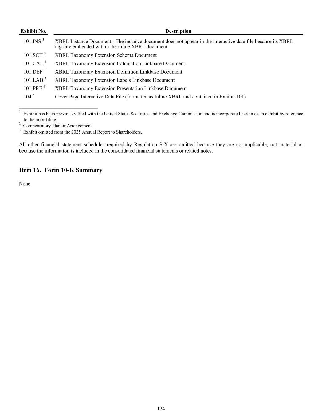 Exhibit No. Description 101.INS 3 XBRL Instance Document - The instance document does not appear in the interactive data file because its XBRL tags are embedded within the inline XBRL document. 101.SCH 3 XBRL Taxonomy Extension Schema Document 101.CAL 3 XBRL Taxonomy Extension Calculation Linkbase Document 101.DEF 3 XBRL Taxonomy Extension Definition Linkbase Document 101.LAB 3 XBRL Taxonomy Extension Labels Linkbase Document 101.PRE 3 XBRL Taxonomy Extension Presentation Linkbase Document 104 3 Cover Page Interactive Data File (formatted as Inline XBRL and contained in Exhibit 101) ______________________________ 1 Exhibit has been previously filed with the United States Securities and Exchange Commission and is incorporated herein as an exhibit by reference to the prior filing. 2 Compensatory Plan or Arrangement 3 Exhibit omitted from the 2025 Annual Report to Shareholders. All other financial statement schedules required by Regulation S-X are omitted because they are not applicable, not material or because the information is included in the consolidated financial statements or related notes. Item 16. Form 10-K Summary None 124