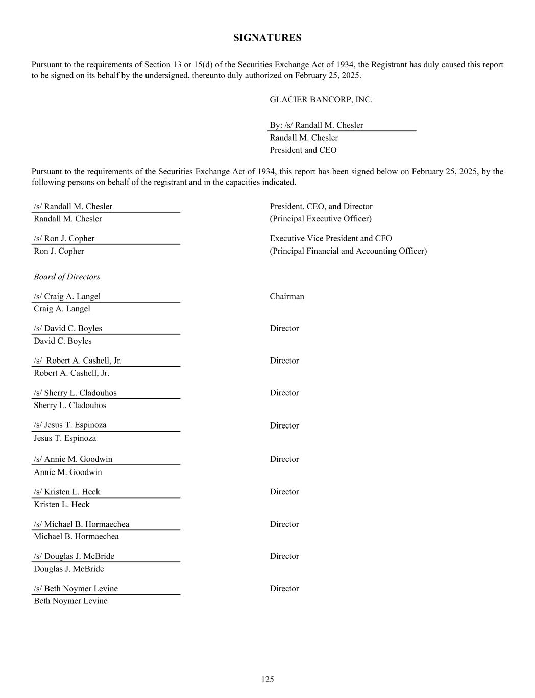 SIGNATURES Pursuant to the requirements of Section 13 or 15(d) of the Securities Exchange Act of 1934, the Registrant has duly caused this report to be signed on its behalf by the undersigned, thereunto duly authorized on February 25, 2025. GLACIER BANCORP, INC. By: /s/ Randall M. Chesler Randall M. Chesler President and CEO Pursuant to the requirements of the Securities Exchange Act of 1934, this report has been signed below on February 25, 2025, by the following persons on behalf of the registrant and in the capacities indicated. /s/ Randall M. Chesler President, CEO, and Director Randall M. Chesler (Principal Executive Officer) /s/ Ron J. Copher Executive Vice President and CFO Ron J. Copher (Principal Financial and Accounting Officer) Board of Directors /s/ Craig A. Langel Chairman Craig A. Langel /s/ David C. Boyles Director David C. Boyles /s/ Robert A. Cashell, Jr. Director Robert A. Cashell, Jr. /s/ Sherry L. Cladouhos Director Sherry L. Cladouhos /s/ Jesus T. Espinoza Director Jesus T. Espinoza /s/ Annie M. Goodwin Director Annie M. Goodwin /s/ Kristen L. Heck Director Kristen L. Heck /s/ Michael B. Hormaechea Director Michael B. Hormaechea /s/ Douglas J. McBride Director Douglas J. McBride /s/ Beth Noymer Levine Director Beth Noymer Levine 125
